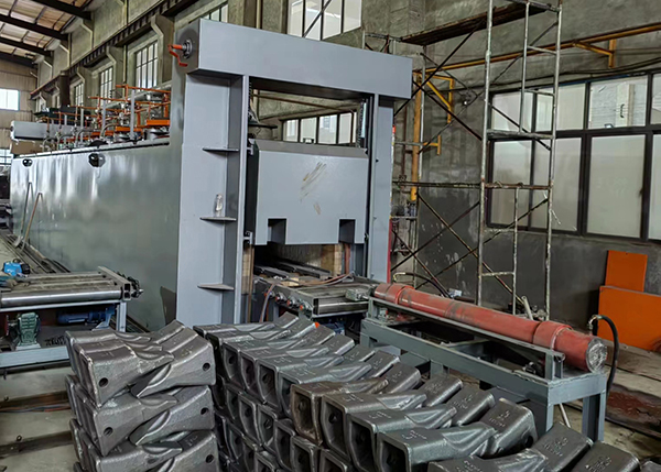 天然氣全自動連續式推桿爐生產線主要用于挖機斗齒進行淬火、正火、回火等熱處理工藝,處理后的工件組織均勻、質量穩定,生產線具有自動化程度高,高效節能、安全可靠等特點。